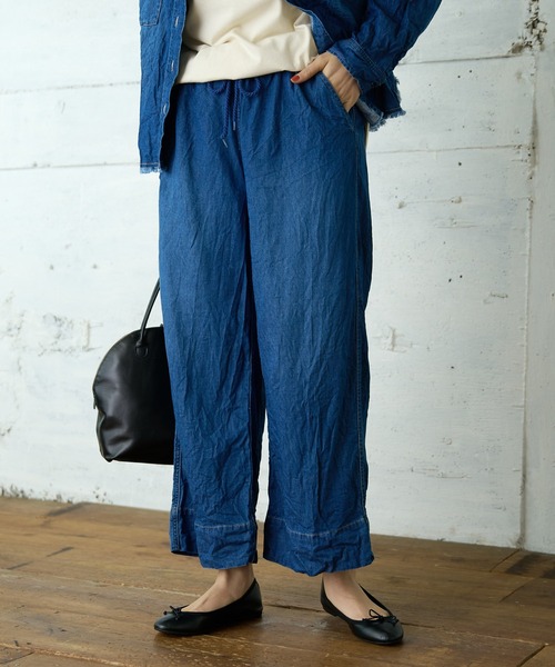 ピュアルセシン 2021 Spring collection 【Effortless garden】 ピュアルらしさでもある天然繊維の素材感、丁寧な生活の中に取り入れてほしい着心地 心弾むファッションを続けていけるように地球の恵みをテーマに変わりゆく時代にあったSSの提案 ◇軽やかな履き心地!リラクシーなデニムパンツ◇ リラクシーな履き心地が特徴的なデニムパンツ。 コットン×ヘンプの混合生地で、シワ感がナチュラル感をプラス。 ウエストは総ゴムでストレスフリー。 ドローコードが入っているのでベルトいらずでウエストサイズが調整可能です。 Tシャツやブラウス等、合わせるトップスを選ばず、 ワンピースの下にレイヤードしたりとワードローブに1枚あると嬉しい1枚。 同素材のブラウス(No.231300230)とのセットアップもオススメです。 ・シーズン問わず着まわせる ・ウエストゴムでお腹周りも安心 ・ゆったりシルエットでストレスフリー ・デイリー使いできるデザイン =============================== 透け感:なし 裏地:なし 伸縮性:なし 光沢感:なし 生地の厚さ:やや薄手 【スタッフコメント】 年齢:20代前半/身長:157cm/普段着用サイズ:Mサイズ サイズ感: 157cmの私で足の甲にギリギリかかる丈感。 身幅はだいぶゆったりでラフな着心地です。 素材感: 肌あたりは柔らかく、チクチクする感じはありません。 =============================== ※他のものに色が移ることがあります。淡色の衣類との組み合わせにご注意下さい。 ※撮影場所やお使いのモニター環境により若干お色味が異なる場合がございます。特にロケの撮影では明るく見える傾向にございます。 ※予約商品はサンプルで撮影をしております。若干の仕様が変更になる場合がございますので予めご了承の上ご注文くださいますようお願いいたします。