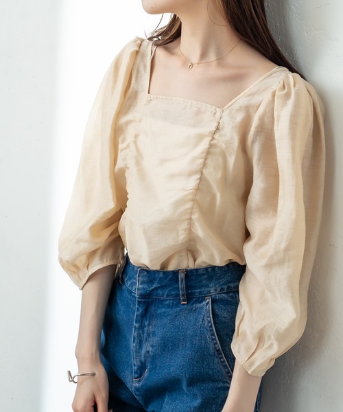 シアーな素材とギャザー使いが魅力なブラウスが登場! 商品ポイント ・透け感のある素材が適度な肌見せを作りレディな印象に。 ・袖はパフ使用になっており身体のラインを華奢に見せてくれます。 ・胸元のがギャザー使いなど女性らしいシルエット。 ・前後両前で使って頂け着回し力も抜群。 スタイリングポイント ・透け感があるのでインナーにはパッド付のキャミソールなどが◎ ・ハイウエストボトムにインスタイルがオススメ。 スタッフ着用コメント 〇153cmスタッフ カラー:ベージュ 生地的に夏まで使えるトップスになっています。 シルエットが女性らしいデザインなので、 シンプルなパンツと合わせて、 上品にまとめるのがオススメです! 〇158cmスタッフ カラー:オフホワイト シンプルなデザインなので、 一枚持っておくと色んな場面で使えます! 両前使え、コーデに合わせて、 背中開きにするか、デコルテ開きにするか 選べるのでスタイリングの幅が広がります! 〇162cmスタッフ カラー:ブラック 軽めな印象のトップスなので、 しっかりめの生地のボトムスと合わせると、 バランスが取れたスタイリングになります。 普段上品めなスタイリングを好む方には、 ブラックがオススメです! ------------------------------------------------------ 裏地:なし 伸縮性:ややなし 光沢感:なし 生地の厚さ:うすい ------------------------------------------------------ ------------------------------------------------------ 商品のお気に入り登録➡ お気に入りアイテムの値下げ・再入荷・在庫1点などの通知を受け取ることができます。 ブランドのお気に入り登録➡ 新商品や再入荷、セール、クーポン配布などお得な情報を受け取ることができます。 ※サイト上のカラー名と、お届け商品に記載されているカラー名が異なる場合がございます。 ※商品の色味は、撮影場所や光のあたり具合などにより色味が違って見える場合が御座います 。 また、お客様のお使いのPCのモニター環境などにより色味が違って見える場合が御座います。 予めご了承の上ご注文下さい。 ※ご注文いただいた予約商品のお届け時期の確認は、注文履歴ページより行えます。 -------------------------------------------------
