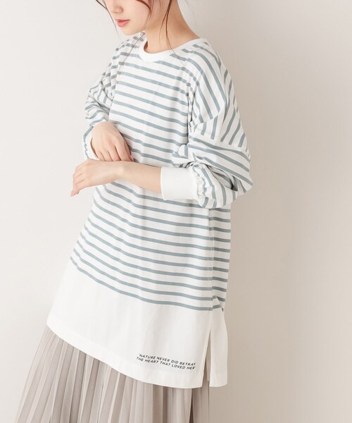 ピュアルセシン 2021 Spring collection 【Effortless garden】ピュアルらしさでもある天然繊維の素材感、丁寧な生活の中に取り入れてほしい着心地心弾むファッションを続けていけるように地球の恵みをテーマに変わりゆく時代にあったSSの提案◇パネルボーダーが目を引く春らしいカットソー◇柄のパターンに無地を入れて織り上げたパネルボーダーのカットソー。色物も優しいトーンで春らしいシリーズです。サスティナブルのRERISEオーガニックコットン100%で、とても柔らかな生地を使用。気温が上がり、袖なしのインナーと合わせる季節も心地良く着られます。ドロップスリーブでゆったりとしたシルエットがかわいいチュニック。首、袖のリブは無地なので、柄のバランスがすっきりとした印象に見えます。袖にはギャザーが入っているので捲るとふんわり。シルエットで遊べるデザインです。定番のカットソーチュニックは何枚持っていても追加したくなるアイテム。無地になっている裾のデザインや、ワンポイントのロゴプリントで被りがちなボーダーアイテムも差を付けて楽しめます。・オリジナルのパネルボーダー柄・春らしい色味がかわいい・ギャザーの袖でシルエットを楽しめる・膝上丈で腰回りをカバー・裾のロゴプリントがワンポイント===============================透け感:シロベースややあり裏地:なし伸縮性:あり光沢感:なし生地の厚さ:普通【スタッフコメント】年齢:30代後半/身長:154cm/普段着用サイズ:Mサイズサイズ感:ドロップスリーブでゆったりとしています。袖付けの幅も広いので腕のラインもカバー出来ます。素材感:コットンでナチュラルな表面感。===============================※撮影場所やお使いのモニター環境により若干お色味が異なる場合がございます。特にロケの撮影では明るく見える傾向にございます。※予約商品はサンプルで撮影をしております。若干の仕様が変更になる場合がございますので予めご了承の上ご注文くださいますようお願いいたします。