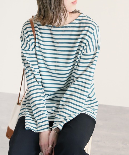 ■Point シンプルなボーダーカットソーは着回し力も抜群で、 忙しい朝でもコーディネートが簡単に決まります! ドロップショルダーとワイドな袖で、 すっきり落ち感のあるフォルムが可愛いです♡ ゆったりシルエットで気になる二の腕やお腹周りをカバー◎ ■Deteil 生地がコットン100%なので、 さらっとした着心地です。 ややボートネック気味のネックラインで デコルテ周りの露出が少ないところがポイントです。 ■Coordinate ベーシックなアイテムなので、デイリーコーデで大活躍すること間違いなし! 手持ちのボトムスとにも合わせやすいく、1枚あれば着回しに大活躍♪ スウェットやシャツのレイヤードアイテムとしても◎ これからの季節ではスウェットやトレーナーの 代わりとして着用するのもオススメです! ■綿素材の商品のお手入れ方法について 綿素材のお洋服はお洗濯方法により縮みやねじれて見える状態になることがございます。はじめてお洗濯をしていただく時に強く縮みが出る事がございます。 そのため、お洗濯の際は「手洗い」または「ドライコース」で行うことをおすすめしております。 また、脱水時間は30秒程度と短くするようにお願い致します。 乾燥機は縮む原因になりますのでご使用はお避け下さい。 干す際は『軽くしわを伸ばして』形を整えてから干していただくことをおすすめしております。 ■■■もっとお買物をお得にお楽しみいただくために■■■ 【商品のお気に入り登録】再入荷のお知らせや、ラスト1点のお知らせ、セールのお知らせを受け取ることができます! 【ブランドのお気に入り登録】新作商品や完売アイテムの再入荷情報など、お得な情報をいち早く受け取ることができます! ※サイズは現物をスタッフが平置き採寸したものになります。 ※モデル着用写真は撮影環境により、多少実際のカラーと異なる場合がございます。 ※生産時期により若干の色ブレやサイズの変動が生じる場合がございます。 生地の素材や種類によってシワになりやすいもの、または同じ素材でも製造時期によって異なる場合がございます。予めご了承くださいますようお願いいたします。 ※モカのみ素材がコットン100%となっております。予めご了承くださいますようお願いいたします。