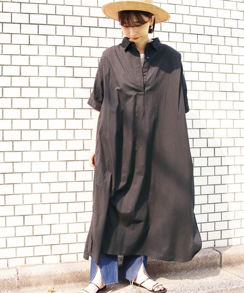 スキッパー襟と袖口の刺繍がポイントのシャツワンピース。 ゆるやかなAラインなので、着こなし易い1枚です。 【STYLING】 テーパードパンツや、ロングスカートと重ねて 春夏の涼し気なレイヤードスタイルに。 旅行やレジャーにはラフなサンダルやかごバッグと 合わせてリラックススタイルで。 タウンユースではシアー素材サンダルやクリアバッグと合わせて きれいめカジュアルな着こなしがおすすめです。 【DETAIL】 ゆったりしたシルエットがカジュアルな印象で、 裾にスリットがあるので動きやすくなっています。 柔らかい肌触りなので、着心地のよい一着。 程よくシアーな素材感。 肩のタックもポイントです。 両サイドにポケットが付いています。 ※お取り扱いに関しましては、商品に付属のアテンションタグをご確認の上、充分ご注意ください。 ※店頭及び屋外での撮影画像は、光の当たり具合で色味が違って見える場合があります。 商品の色味は、スタジオ撮影の商品画像をご参照ください。 ※撮影場所やお使いのモニター環境により若干お色味が異なる場合がございます。 ※この製品はインドで生産されたものです。 手作業による暖かみのある独特の風合いをお楽しみください。 生地の織りむら、染色むら、多少のプリントのズレは商品の特徴のひとつです。ご了承下さい。 ※デリケートな素材を使用しておりますので時計やアクセサリーなどに引っ掛けないようご注意下さい。 ※お洗濯で多少縮みます。なお、乾燥機の使用はお避け下さい。 ※汗や湿気、強い摩擦により、他の衣類に色移りをする事があります。 ※こちらの商品は生地のデザイン上、一点一点風合いや色味、柄やサイズ感が画像または表記サイズと 若干異なる場合がございます。