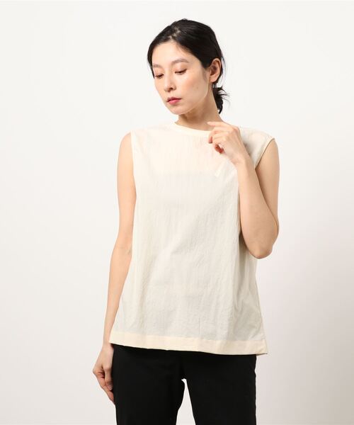 日差しも暑さも気にしない高機能素材のノースリーブブラウス接触冷感、UVカット、ストレッチ性を兼ね備えたナイロンワッシャー素材のノースリーブブラウス。汗をかく季節に快適なドライタッチと表情のある素材感が涼しげな印象。肩先にかかる幅広のノースリーブブラウスは1枚で着こなすのはもちろん、ジャケットなどのインナーとしても活躍します。同素材のナイロンストレッチIラインスカートやナイロンストレッチテーパードパンツと組み合わせてセットアップで楽しむのもおすすめです。