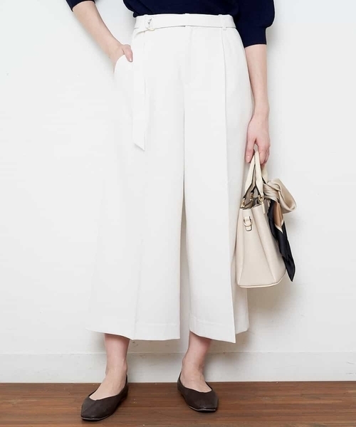 ■デザイン 太すぎない、ストレートに近いワイドシルエットにこだわって作りました。 ウエストのタックと、取り外し可能なDカンベルトで、 ウエスト周りが気にならないデザインにしています。 ■素材 ソフトな風合いとストレッチ性に加え、二重織りでハリ感が素材です。 体のラインがでにくく、シワも気にならず、着用した時にすっきり見えるのが嬉しいポイント。 model:H165 B78 W58 H85 着用サイズ:M ※屋外での撮影は色味が多少異なる場合がございます。 商品の色味は、スタジオ撮影の画像をご参照ください。 ※サンプルでの撮影となるため、実際にお届けする商品と 仕様やサイズが異なる場合がございます。