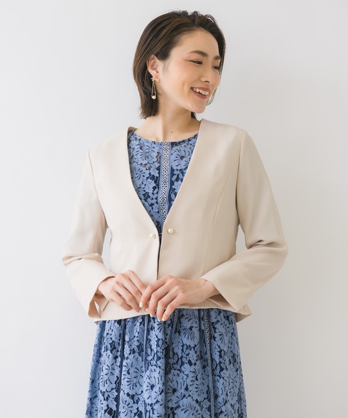 【KATHARINE ROSSセレクト】お食事会・入学式・卒業式・結婚式・二次会・謝恩会・成人式におすすめフォーマルシーンにぴったりのショートジャケット。ロング丈のワンピースと相性が良い丈感で、コーデのしやすいアイテム。パールをピンから着脱する、デザイン性のある止め具を採用しています。ノースリーブのワンピースにプラスしたり、春秋冬のドレスの上に羽織るのにぴったり。長袖なのでインナーの袖を選ばないデザインです。