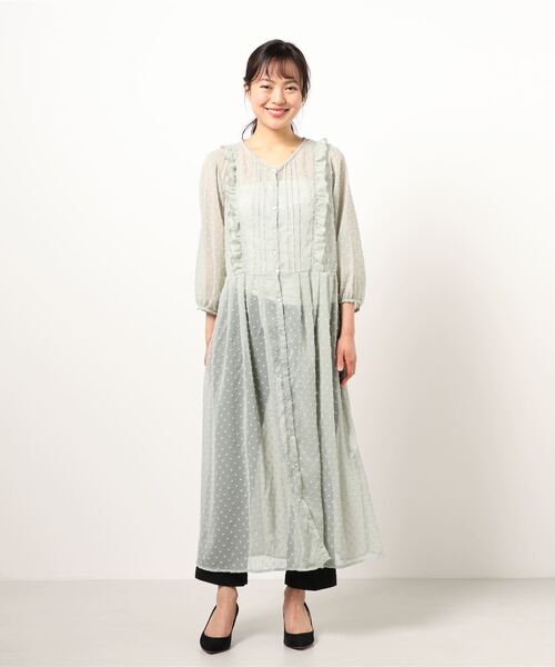 立体感のあるドビードットが愛らしい表情をプラスするワンピース。フリルの切替やボリュームのあるスリーブも甘さをプラス。タックの生み出すふんわりとしたスカートシルエットもポイントです。旬なシアー素材で軽やかに仕上げたアイテムは、これからのシーズンコーデにも活躍してくれます。
