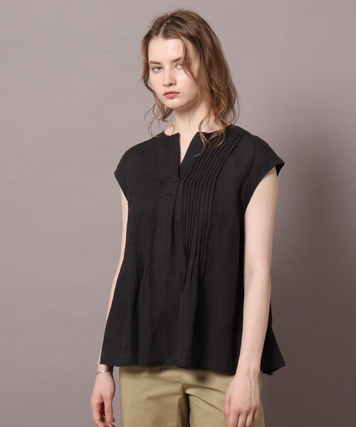 【夏のスタイルを軽やかに見せてくれるラミー製品染シリーズ】 ピンタックをたっぷりと寄せたAラインのフレンチスリーブブラウス。 ヨークや襟の細いダブルステッチで少しクラシックな雰囲気に。 袖口の見返しを広くして張りを出し、フレンチスリーブのシルエットがきれいに出るようにしています。 100/1という細く繊細なラミーの糸を使用し、製品染めしてナチュラルな風合いに仕上げています。 ラミーは麻の中で最も繊維が長く光沢があり、白度が高いので発色が良いのが特徴です。 カーゴパンツやデニムとのスタイリングや、スティックパンツとサンダルで女性らしい雰囲気もおすすめです。 ※こちらの商品はやや透け感があるため、インナーの着用をおすすめします。 こちらの商品は主に夏に着用いただける商品です。 モデル情報:身長165cm B81 W60 H86 着用サイズ:38(M) 店舗へのお問い合わせ商品番号:085-82080 ●製品寸法: 38(M):着丈63cm B107cm 肩幅51cm 裾幅165cm 備考: