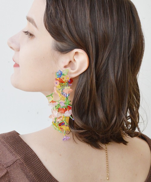 鮮やかに彩り、目を奪われるピアスボリューミーで存在感があり、一目置かれるようなアイテム。透明感のあるお花たちが、顔回りに華やかさをプラスしてくれます。季節ならではのシンプルなワンピースなどとの組み合わせも◎コーデのポイントとしてオススメ。彩りを加え主役になるピアスです。【 ma chere Cosette? 】"Cosette"とは、フランス語で「いらないもの」という意味。他人にとってはいらないものであっても、自分にとってはかけがえのないものというブランドテーマで、他にはないデザインのバッグやアクセサリー等を展開しています。※画像の商品はサンプルです。実際の商品と色味、仕様、サイズ等が若干異なる場合がございます。