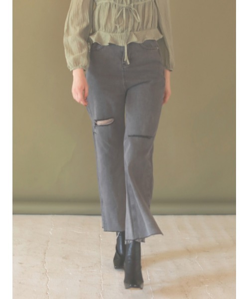 太ももの位置に施されたダメージ加工と裾スリットが足を長く綺麗に見せてくれるストレートデニム。アンクル丈のショートブーツと合わせて更なるスタイルUPも◎絶妙なグレーカラーはカットソーから布帛、ニットまで色んなスタイリングにマッチしオシャレ感をだしてくれるので、普段のデニムからキマるパンツとして楽しめる一着です。----------------------------※ご注文いただいた予約商品のお届け時期の確認は、注文履歴ページより行えます。【お買いものをもっとお楽しみいただく為に】▼商品のお気に入り登録(ハートマークをクリック)完売カラーの再入荷通知や、ラスト1点の通知、セールの通知を受け取ることができます。▼ブランドのお気に入り登録新商品や再入荷など、いち早くブランドのお得な情報を受け取ることができます。
