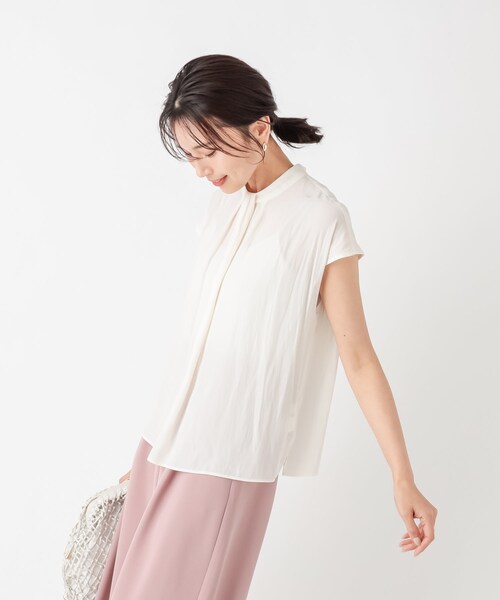 今季押さえておきたいトレンドのボウタイデザインのブラウス程よい光沢感と上品な滑らかさが魅力のブラウス。流れるようなボウデザインは、スタイリングに上品をプラスします。UVカット・速乾性・接触冷感とこれからの季節に嬉しい機能付き。オフィスシーンなどきちんとした場にももちろん、普段ならデニムパンツにさらりと着こなすのもオススメです。・程よい高さの衿が上品で女性らしい・身に纏うだけで洗練された品の良さを演出してくれる・どんなボトムとも相性よく、ワードローブに加えたいアイテム・程よい光沢感とでフェミニンな印象に仕上げてくれる洗濯方法:手洗い透け感:あり裏地:なし伸縮性:なし生地の厚さ:薄手光沢感:ややありモデル情報:H165 B83 W60 H84 着用サイズ:F詳細着用モデル:H159cm 着用サイズ:F#今買いアイテム#デイリーユース#お仕事スタイル#映えトップス#主役アイテム#長袖#無地#ショート丈#華やぎアイテム#ライトカラー--------------------------------------------------------------------------------【注意点】※画像の商品は光の照射や角度、お使いのモニター環境により、 実物と色味が異なる場合がございます。あらかじめご了承下さいませ。--------------------------------------------------------------------------------【『♡』をクリックでお気に入り登録】・ラスト1点や再入荷の通知が届きます。 --------------------------------------------------------------------------------