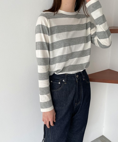 デザイン コーディネートにメリハリを与えるワイドボーダーのカットソー。 ネックは細バインダー仕上げでスッキリした印象に。 1枚で着てもサマになるゆとりのあるシルエットで、カジュアルスタイルの主役にぴったりです。 素材 オーガニックコットンを使用した天竺素材。 体にピッタリと添い過ぎない、ゆとりのあるサイズ感でヒップも隠れる長めの着丈です。 コーディネート 程よい着丈と軽やかな生地感で、一枚で着たりレイヤードを楽しんだり、スタイリングのバリエーションの広さも魅力です。 ------------------------------------- 生地の厚さ:厚い〇〇〇●〇薄い 伸縮性:縦あり・横あり 透け感:あり 裏地:なし 光沢:なし 水洗い:可 ------------------------------------- harmonie -Organic Cotton-(アルモニ オーガニックコットン) 人々が安心して暮らせる環境を物作りを通じて伝えたい。そんな思いからスタートしたオーガニックコットンの製品作り。 農薬や化学肥料を使わずに育てる方法は、通常のコットンに比べて手間も時間もかかります。 harmonie -Organic Cotton- では安心な暮らしのお手伝いができる商品を提供していきたいと考えています。 移り変わるトレンドファッションを求めるのではなく、良き着心地・縫製・商品など、日本の伝統が守られた場所で生産され、細やかな心遣い・仕事の丁寧さ・日本人独自の正確さを表現できる国内縫製工場と取り組んだMADE IN JAPAN ブランド。 harmonie(アルモニ)オリジナル素材のふんわり天竺素材は、 しなやかに生地に空気を含んだような、ふんわりとした風合いで、生地が軽く着用時にストレスを感じさせず、優しい着心地を1日中与えてくれます。 ※天然天竺素材の洗濯後の仕組み 洗濯の際に、天竺生地は横方向/縦方向 両方から縮む傾向があります。同時に斜行なども発生する可能性があります。 洗濯の際にデリケート素材になればなる程できる限り動かさずに洗う事が必要になります。 天然繊維の弱点としては、洗濯の際に伸び縮みが発生してしまいますが、その分、優しい着心地を与えてくれるメリットがあります。 洗濯の際に縮みや伸びを避ける為には、化繊(polyester 100% や nylon 100%)の素材を使用した洋服選びになってしまいます。 弊社では、天然繊維独自の優しい着心地を感じられるアイテムを生産しております。 -ATTENTION- ※末永く愛用頂く為に、アテンションタグを必ずご確認の上、着用又はお取り扱い下さい。 ※商品の写真はサンプル品を撮影している為、実際の商品とは仕様や加工、加工によるダメージ、サイズ等が若干異なる場合もございます。 ※屋外での撮影画像は、光の当たり具合で色味が異なって見える場合があります。詳細画像をご参照ください。