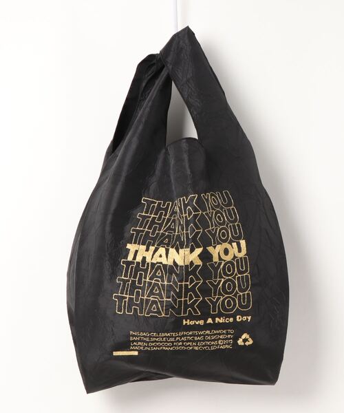 エコと正反対のデザインを採用することで、エコを訴えるユニークなアイテム 人気のOPEN EDITIONSのトートバッグです! ビニール袋のデザインをそのままに、光沢のあるポリエステル生地に施されたキャッチーな刺繍が特徴でシンプルながらデザイン性の高さも魅力的。 です。 セカンドバッグとしてはもちろん、メインバッグとして持つだけでトレンド感あるこなれた印象に。 アメリカで一番最初に使い捨てのプラスチック製レジ袋が禁止されたサンフランシスコを拠点にアーティストのローレン・ディチョッチョがデザインを手がけるブランド。 アメリカの雑貨店や市場などで使われているビニール袋のデザインをそのまま光沢のあるリサイクルポリエステル生地で再現しています。 表面のグラフィックは刺繍で施されており、エコと正反対のデザインを採用することで、エコを訴えるユニークなアイテムです。 多くのファッショニスタがコーディネートに取り入れたスタイルをSNSにアップしたり、セレクトショップでも取り扱われるなど、入手が困難な最旬のエコバッグです。 OPENS EDITIONS(オープンエディションズ) デザインと製造を手がける「OPEN EDITIONS」は、アメリカで最初にビニール袋の禁止条例を制定したサンフランシスコを拠点にユニークな活動をしています。
