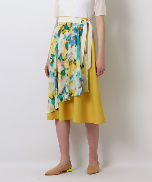 プリントと異素材の配色が目を引くアシンメトリーデザインのスカート。 【素材】 麻のようなナチュラル感とドライな風合いのリネンライクファブリックに、大胆なマーブルプリント柄をレイヤード。 異なる素材を組み合わせることで、存在感のあるキャッチーなアイテムに仕上げました。 【シルエット/デザイン】 アシンメトリーにレイヤードさせたフレア部分が、歩くたびに繊細に揺れて女性らしい印象に。 ウエスト後ろはゴム仕様になっているので、ストレスフリーな履き心地も嬉しいポイントです。 【スタイリング/その他】 シンプルなニットやTシャツを合わせ、配色デザインを際立たせたコーディネートがおすすめです。