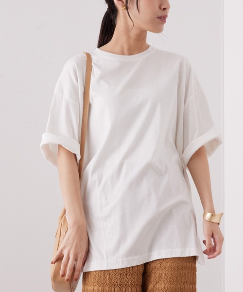 ゆるっとしたシルエットがかわいいビッグTシャツです。■POINTコットン100%の柔らかい生地にシルケット加工を施し、なめらかな風合いに。肌触りがよく、暑い夏もサラッと着られる嬉しい素材感がポイントです。肩を落として袖も少し長めにしたことでリラックス感のある仕上がりに。両サイドにスリット入りなのでアウトでも様になります。■COORDINATEアウトで着るときはスッキリとしたパンツや、ロング丈のスカートがオススメ。キャミワンピースの上から重ねて着ても素敵です。スリット入りなので前だけインしてもスッキリと着られます。カラーパンツとの相性も◎-----------------------------裏地:なし光沢感:あり透け感:ややあり伸縮性:なし生地の厚さ:やや薄手-----------------------------