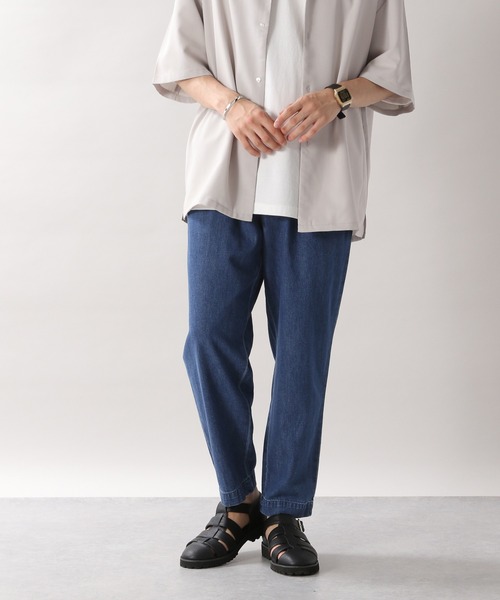 夏も快適に穿ける綿麻素材のデニムパンツ。 フロントにタックを入れ、腰回りはゆったりなルーズなサイズ感に仕上がっています。 また、裾にかけて程よくテーパードをかけているので脚のラインを綺麗にみせてくれるのも嬉しいポイント! Tシャツはもちろん、シャツと合わせたスタイリングもおすすめです!