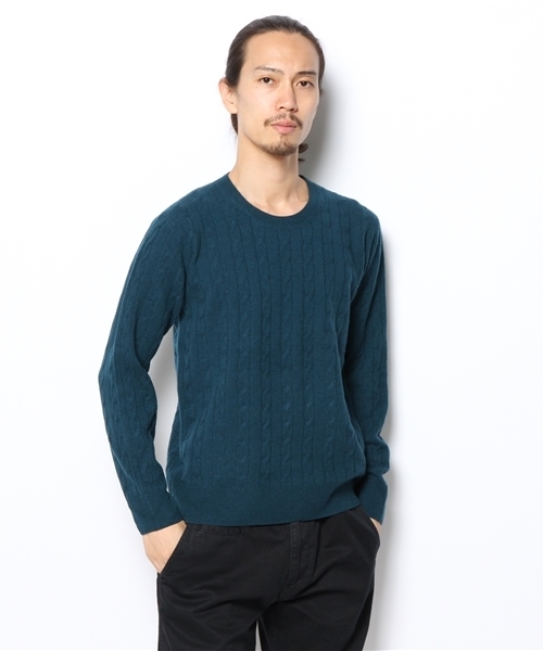 12ゲージのケーブル編みクルーネックセーターです。 カシミアが10%ブレンドされていて、 とても滑らかな肌ざわり。 薄手のセーターですが保温効果も高く、 季節の変化に応じて色々な着こなしが楽しめそうです。 メルトン系のアウターやチェスターコート、 リブパンとも抜群の相性です。
