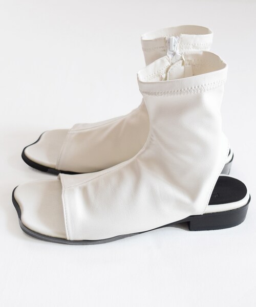 足首が細く見える美脚効果のショートブーツです。 フェイクレザーの滑らかな質感とマットな表情が高級感溢れるOpen toe booty。 足袋型のスクエアトゥがモードな印象を与え,ショート丈からマキシ丈までコーディネートを選ばず活躍する絶妙なバランスでスタイリングを完璧に仕上げてくれます。 スカートやワンピースなどのアイテムとも好相性。 今年はWHITEカラーのSHOESがコーデのマストアイテムに。 ーーーーーーーーーーーーーーーーーー 【セレクト】rococo 【COLOR】ホワイト・ブラック 【SIZE】23.0cm・23.5cm・24.0cm・24.5cm 【ソール】かかと 約3.0㎝ 【素材】本体 合成皮革