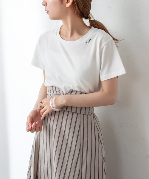 刺繍ロゴがアクセントに!コンパクトなサイズ感がレディに決まる1着! 商品ポイント ・手書き風のちびロゴがスタイリングのアクセントになるTシャツ。 ・コンパクトなサイズ感で1枚で着てもレディな印象に。 ・裾は前後差をつけておりアウトスタイルもオススメ。 ・柔らかい素材で着心地も◎ スタイリングポイント ・シンプルなスタイリングのアクセント使いにオススメ。 ・ジャケットなど綺麗見えするアイテムと合わせてカジュアルダウンさせるのも◎ スタッフ着用コメント 〇151cmスタッフ カラー:オフホワイト 王道な白Tなのですが、 ワンポイント小さくロゴが入っているので、 シンプルなボトムスと合わせても きまりやすいです! 〇158cmスタッフ カラー:グレー系その他2 ロゴが中央ではなく、 首元に入っているのが特徴的で、 とても気に入っています! グレーは、カジュアルになりすぎず、 大人な印象のスタイリングに合わせやすいので おすすめです。 〇162cmスタッフ カラー:ベージュ ロゴの大きさがちょうどよく、 幅広い系統のスタイリングに合わせやすいので 優秀アイテムです! ベージュは、シンプルなアイテムと合わせても こなれた印象になるので、 一枚持っておくと便利です! ※洗濯、取り扱い 洗濯:手洗い可 アイロン:110℃まで可 タンブル乾燥:不可 ドライクリーニング:不可 漂白剤使用:不可 ------------------------------------------------------ 裏地:なし 伸縮性:あり 光沢感:なし 生地の厚さ:ふつう ------------------------------------------------------ ------------------------------------------------------ 商品のお気に入り登録➡ お気に入りアイテムの値下げ・再入荷・在庫1点などの通知を受け取ることができます。 ブランドのお気に入り登録➡ 新商品や再入荷、セール、クーポン配布などお得な情報を受け取ることができます。 ※サイト上のカラー名と、お届け商品に記載されているカラー名が異なる場合がございます。 ※商品の色味は、撮影場所や光のあたり具合などにより色味が違って見える場合が御座います 。 また、お客様のお使いのPCのモニター環境などにより色味が違って見える場合が御座います。予めご了承の上ご注文下さい。 ※ご注文いただいた予約商品のお届け時期の確認は、注文履歴ページより行えます。 ------------------------------------------------------ "