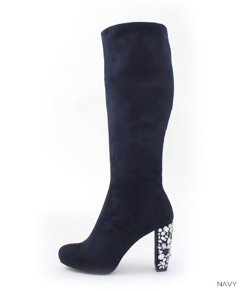 素材:合成皮革(スエード)ファスナー:有ビジューヒールがラグジュアリーなロングブーツです。ランダムに配置したストーンパーツは色合いと形の組み合わせまでとことん拘りました。スッと伸びたヒールで、女性らしさを後押しします。スエード素材とクラシカルなラウンドトゥで品よく華やかな1足です。