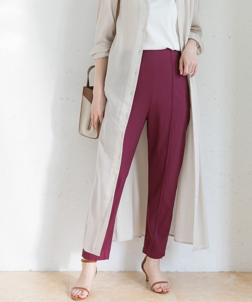 【鮮やかカラーを楽しむ、ピンタックテーパードパンツ】 センタープレスの変わりにピンタックのラインが入ったテーパードパンツ。 縦のラインを強調してくれ、スタイルを良く見せてくれます。 無駄の無いシンプルなシルエットは、合わせるトップスを選びません。 いつものスタイリングをアップデートしてくれる綺麗カラーにも注目です。 ----------------------------- 透け感 : なし 伸縮性 : なし 裏地 : なし 光沢 : なし ポケット : あり ----------------------------- ※直射日光や蛍光灯に長時間あたると変色したり、色褪せすることがありますのでご注意ください。 ※商品画像は、光の当たり具合やパソコンなどの閲覧環境により、実際の色味と異なって見える場合がございます。予めご了承ください。 ※商品の色味の目安は、商品単体の画像をご参照ください。 ▼お気に入り登録のおすすめ▼ お気に入り登録商品は、マイページにて現在の価格情報や在庫状況の確認が可能です。 お買い物リストの管理に是非ご利用下さい。 3836