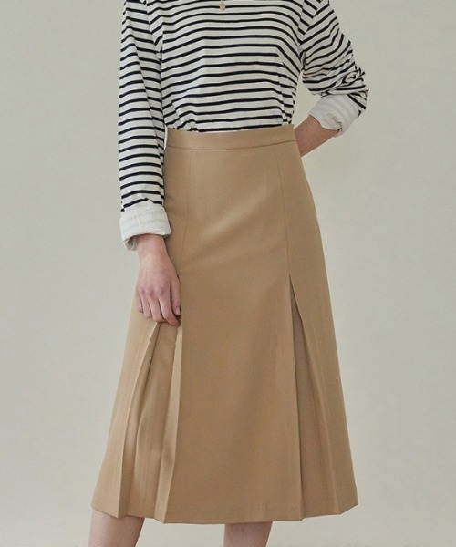 Aラインシルエットのプリーツミディスカートです。両側にシンプルなプリーツディテールを加えて、活動時に快適で様々なスタイリングが可能です。しわがつきにくいシルキーな素材で製作され、裏地を加えました。