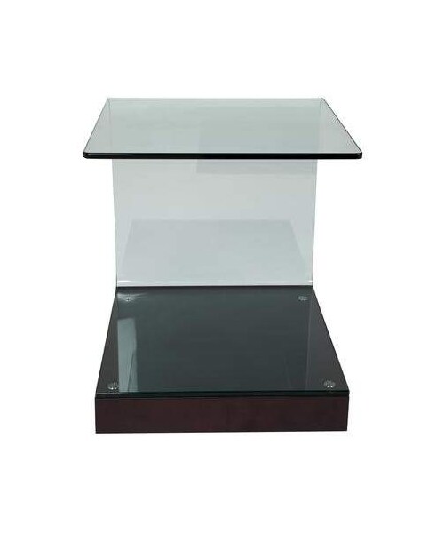 Clear glass and dark wood Reflex side table with curved glass design at glass top and silver-tone metal accents at base. For our oversize Art & Home items such as Furniture and Area Rugs, we provide a White Glove delivery service which includes in-room delivery, assembly and removal of packing materials. Our deliveries typically take 4 to 6 weeks from the time the order is placed.