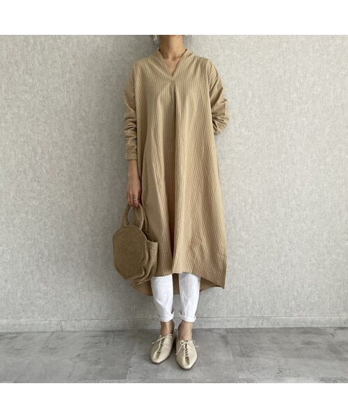 シンプルなストライプ柄!上品な印象に仕上げたシャツワンピースです。 ふんわりと広がるフレアシルエットが女性らしい雰囲気を演出してくれます。 バックロング丈のタックデザインで動くたびに揺れるシルエットが魅力! 綿100%素材のさらっとした着心地の良さもポイント! シンプルに着るのはもちろん、パンツなどのボトムスを合わせたレイヤードコーデもおすすめです★ ※モデル身長:161㎝ ◾️クリックポストにて代引きをお選び頂いた方は、390円プラスさせていただき、宅配便の代引きにて発送させていただきますのでご了承下さい。 ◾️カラー ベージュ ◾️サイズ 着丈:105cm/115cm 肩幅:57cm 身幅:110cm 袖丈:48cm 裾幅:190 cm ※多少の誤差は予めご了承ください。 ◾️素材 綿100%