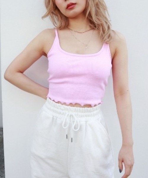 メローフリル仕立てのヘムが愛らしいアクセントに映えるキャミ! 華奢なストラップは調節付きで、フィット感のアレンジ可能。ブラ要らずでスマートに着こなせる、パッドインタイプなのも嬉しい◎ 単品で大胆ヘルシーに着こなすのはもちろん、カーデなど羽織のインナー使いにと、さまざまなコーディネートが楽しめる優秀アイテムです。