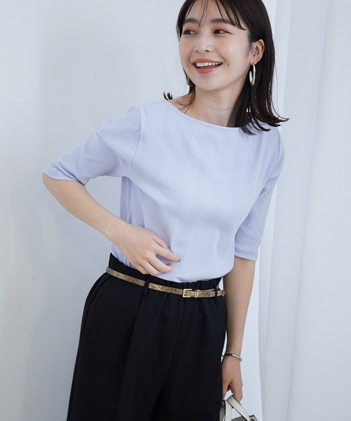 シンプルに着こなしてもサマになる万能トップス。【デザイン・シルエット】すっきりとしたフィット感の5分袖プルオーバー。横に広がる浅めのボートネックで、女性らしさをプラスしました。肘に掛かるほどの袖丈で、二の腕が気になる方にもおすすめです。【素材】伸縮性のあるランダムテレコを使用しています。【カラー】合わせやすく柔らかなカラーを揃えました。【おすすめのスタイリング】ワイドボトムにインしたスタイリングがおすすめ。ジャケットやカーディガンのインにもぴったりです。-----------------------------裏地:なし光沢感:なし透け感:なし伸縮性:あり生地の厚さ:普通-----------------------------【モデル着用サイズ】全色モデル身長:160cm、着用サイズ:Fベージュ以外着用モデル身長:166cm、着用サイズ:F※画像の商品はサンプルです。 実際の商品と仕様、加工、サイズが若干異なる場合がございます。