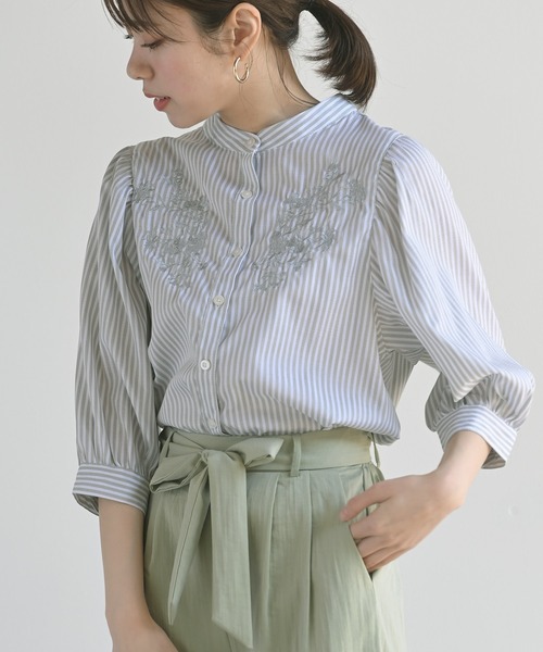 可憐な刺繍がコーデを彩るフェミニンブラウス胸元の刺繍がポイントの可愛らしいブラウス。繊細なデザインと単色使いで上品な彩を添えてくれます。ふわっとハリのある布帛地が爽やかな印象に。袖山のギャザーが作るふっくらとしたスリーブラインも女性らしい雰囲気を演出します。首元はスタンドネックですっきりと仕上げました。清楚で好感度の上がる1枚♪※ブラックはチェック、その他はストライプ柄になります裏地なし伸縮性なし薄手前開きボタン留め袖口ボタン開閉可織キズやだま等みられる場合もございます洗濯:手洗い可