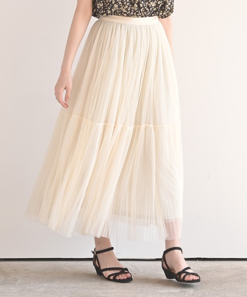 ほどよくボリューミーなティアードチュールスカート 軽快な揺れ感が楽しめる細かいプリーツを施したチュールスカート。 トレンドのティアードデザインで程よいボリューム感を演出します。 裾は切りっぱなしで足元を軽やか&爽やかに。 落ち感のあるロング丈が着ぶくれを防いでくれます。 リラクシーに着られる総ゴムのウエスト。 女性らしく清楚で品の良いコーデが楽しめる旬のスカートです♪ 裏地あり 伸縮性なし 薄手 ウエスト総ゴム 洗濯:手洗い可