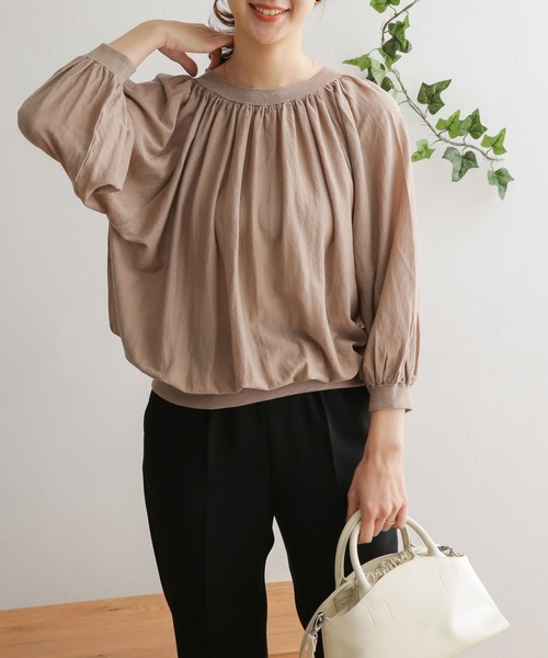 シャリ感のあるハイツイストニットでギャザーたっぷりのプルオーバーをご用意しました。ブラウスのようなデザインがコーディネートに華やかさをプラスし、布帛よりもライトで涼しげに着られるためこれからの長いシーズン着用が可能。薄手でありながらも透けはあまりなく、上品な面持ちがオンタイムにも活躍しそう。袖口や裾の切り替えが全体をまとめてくれるのでボリュームが出すぎず、合わせるボトムスも選びません。※濃色の商品は、他の物に色が移ることがありますので、分けて洗濯してください。また、着用時の摩擦や、汗、雨などで濡れた時は、他の衣料や下着に色移りすることがありますのでご注意ください。※引っ掛けや引っ掛かりが起こりやすくなっています。着脱の際には充分ご注意ください。※その他お取り扱いに関しましては、商品に付属のアテンションタグをご覧ください。※商品画像は、光の当たり具合やパソコンなどの閲覧環境により、実際の色味と異なって見える場合がございます。予めご了承ください。※商品の色味の目安は、商品単体の画像をご参照ください。-----------------------------透け感:ややあり伸縮性:ややあり裏地:なし光沢:なしポケット:なし-----------------------------
