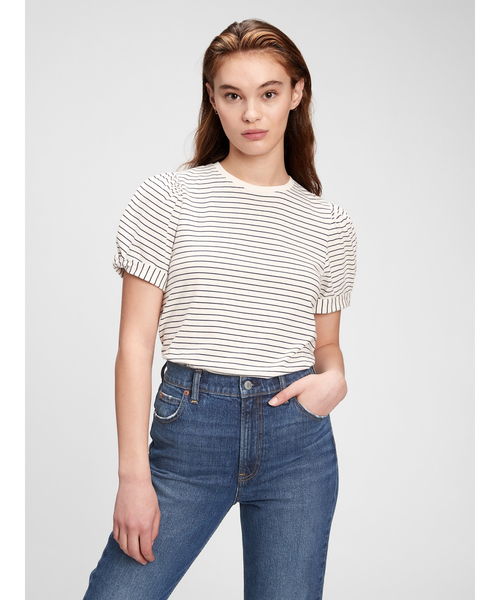 柔らかいニット素材 半袖パフスリーブ クルーネック 柄・カラーバリエーションありストレートシルエット、リラックスフィット※商品タグに記載の価格とサイト上の販売価格が異なる事があります。