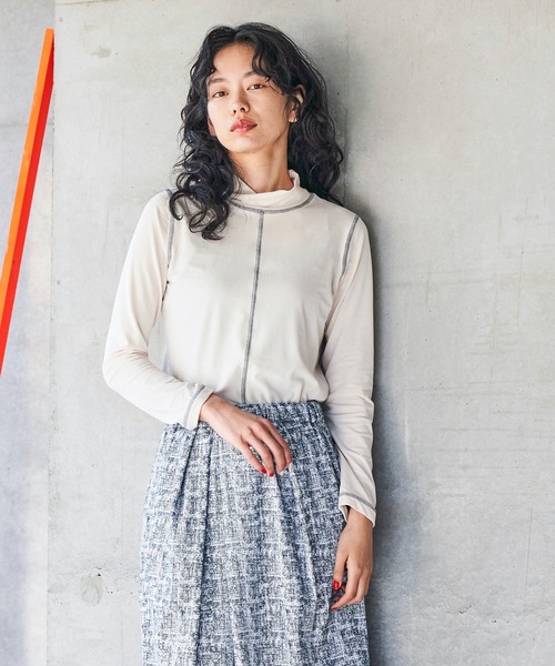 sneeuw 2021AW COLLECTION 先行予約スタート 予約受付 4月24日 PM23:59 とても柔らかで肌触りの良いベロア素材でできたハイネックプルオーバー。 配色で入ったステッチがポイントになり、体のラインを綺麗に見せてくれます。