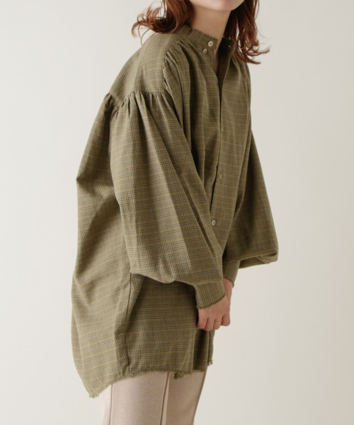 環境にも配慮したリサイクルヤーンを使ったボリュームブラウス■デザインボリューム感がポイントのブラウスの登場。ボリューム袖に身幅もたっぷり取ったシルエットは今年らしいアイテムです。裾のカットオフやギャザー使いで細かいディティールにこだわっています。リサイクルヤーンを用いた環境に配慮した生地を使用しているのもポイントです。※アイボリー:無地 ベージュ、グリーン:チェック■コーディネートたっぷりとボリュームのあるシルエットなので細身のパンツが相性抜群。腰回りの隠れる長さなので、細身のパンツに抵抗のある方にもおすすめのコーディネートです。スタンドカラーなので、インナーにハイネックを合わせるのも◎前を閉じても羽織でも使えるブラウスは朝晩気温の変化のある春に重宝します。Thank Mat'l.環境に敬意を払い、今あるものを最大限に大切にします。古さは個性として楽しむことで味わい深いものとなり、捨てられるはずだったものは、工夫とアイデアで新しい価値として生まれ変わり、またわたしたちの毎日を彩ります。これからもファッションが、心地よくそばに在り続けられる未来を目指します。・・・・・・アイテムに使用しているリサイクル糸は、不要になった商品や生地、縫製工場での裁ち落とし等を回収した物を原料とし、元々付いていた色を生かして紡績しています。染色をしていないので、通常の染色時に生まれる全ての環境汚染を防ぐことができます。その為若干の色の個体差やムラ感があり、独特な表面感が出ています。1点1点異なる、風合いの違いをお楽しみください。※生産時期により色・素材・サイズ感など多少異なる場合がございます。※掲載画像の商品の色味は、屋外や屋内の光の照射や角度により実物と色味が異なる場合がございます。また表示のサイズ感と実物は若干異なる場合もございますので、予めご了承ください。▼商品のお気に入り登録完売カラーの再入荷通知や、ラスト1点の通知、セールの通知も受け取ることができます。▼ブランドのお気に入り登録新商品や再入荷等、いち早くブランドのお得な情報を受け取ることができます。<返品・キャンセルについて>・着用・洗濯後の返品・ご交換は致かねます。・商品到着後、着用前に商品を確認して頂きますようお願い致します。