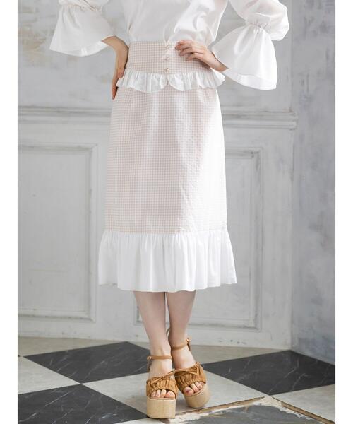 ギンガムチェック×無地×アイレットレースで、フレンチガーリーなスカート!ハイウエストにマーメイドシルエットで、スタイルアップ抜群のスカートです。ギンガムチェック×無地×アイレットレースを掛け合わせ、フレンチガーリーなテイストを意識しました。ガーリーなブラウスやトップスはもちろん、シンプルなロゴTシャツに合わせるのも◎パフスリーブフリルブラウスとのコーディネートがおすすめです。※モデル着用画像は、光の当たり具合で色味が違って見える場合がございます。商品の色味は、商品詳細画像(アップ画像)をご参照ください。【ご注意事項】※サンプルにて撮影を行っております。実際にお届けする商品と仕様やサイズが異なる場合がございます。