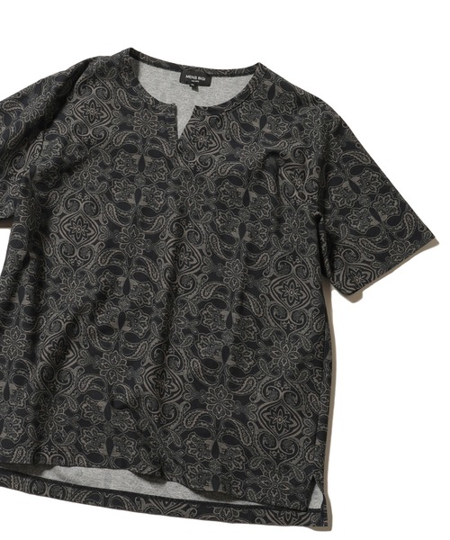 【シャリ感のある生地で暑い夏も快適。華のあるペイズリープリント】不規則な微凹凸の梨地織の一種であるアムンゼン組織に、落ち着きのある上品なカラーリングでペイズリープリントを施したスキッパータイプのカットソー。 【デザイン・カラー】 薄手でしなやかな印象の生地感と緻密なペイズリープリントでエレガントな雰囲気。 ペイズリープリントは全面に施していますが、風合いのあるこだわりのデザインで賑やかになりすぎません。 首周りに切り込みのあるスキッパータイプを採用し、大人のカジュアルスタイルにぴったりなスタイルに仕上げました。 『ネイビー』はよりスタイリッシュな印象に、『ブラック』は上品な印象です。 【素材】 アムンゼンとは日本独自の織物の呼称。 糸を不規則かつ複雑に交差させ、布面に梨の皮のような細かいシボを作り独特の質感を表現した生地。 このシボ感のおかげで直接肌に張り付かず、さらりとした清涼感のある手触りのため汗ばむ季節にも快適にお過ごしいただけます。 【コーディネート】 上品な首周りに仕上げてくれるスキッパータイプのカットソーは、落ち着いた雰囲気のジャケットとも好相性。 長すぎず短すぎない絶妙なサイジングの丈感はすっきりと1枚で着こなすのにも最適です。 ブラックなどの落ち着いたトーンのパンツと合わせて、足元は素足を見せるデザインのシューズを選ぶと抜け感のあるスタイルが完成します。 【サイズ表記に関して】 商品タグにはサイズ部分に数字が表記されています。 01はSサイズ, 02はMサイズ, 03はLサイズ, 04はLLサイズを表します。 モデル 身長184cm 胸囲95cm ウエスト78cm ヒップ94cm 着用サイズ:03(L) ※着用画像は光の加減等で仕様が異なる場合があります。 ※着用画像はサンプルのため仕様が異なる場合があります。