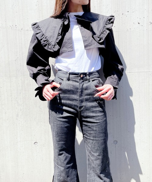 ◆レイヤードにぴったりなショート丈ブラウストレンドのショート丈をガーリーなブラウスに落とし込んだビッグフリルブラウス。一枚でブラウスとしても、前を開けてジャケットとしても着こなしができます。Tシャツやキャミソール合わせなど様々な着こなしができ、トレンドのスタイルが完成します。ボタンはさりげなくハートに♡