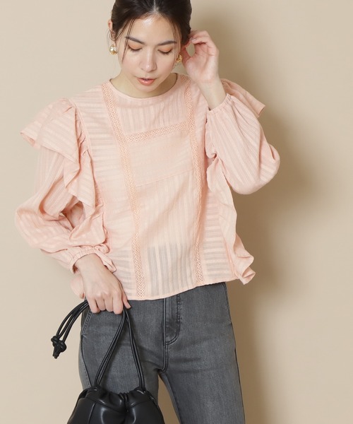 着映え感のあるショルダーフリルブラウス。前後でポイントになる大きなショルダーフリルが可愛らしいデザインです。カジュアルにデニムパンツ、きれいめなスラックス、ハーフパンツともコーディネートを楽しめます。コットン素材を使用しており、初夏にむけて着やすい風合いです。