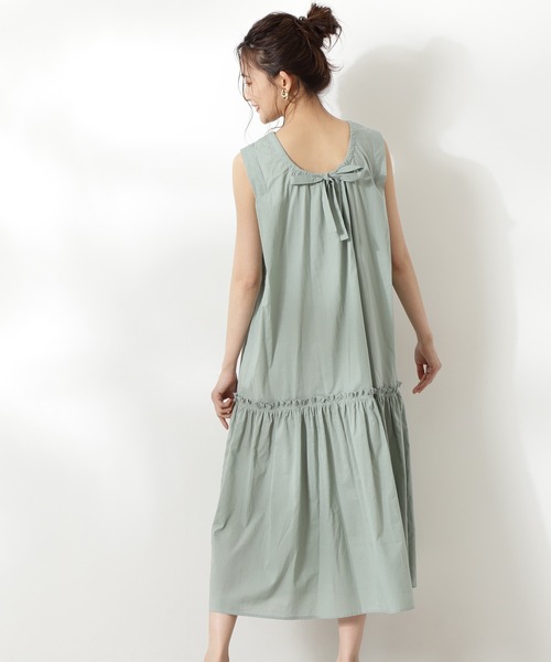 さっぱりとしたコットンローン生地を使用したサマーワンピース。肩先からショルダーラインがすっきり見えるタックデザイン、ローウエストにギャザーで表情をつけたフェミニンなデザインです。 フロントは詰まったネックライン、バックスタイルは肌見せするラウンドネックにリボン付きで、抜け感をプラスしています。 アームホールや身頃もほどよく余裕があり、リラックスしたシルエットで心地よく着ることができます。 ※ペチコート付き