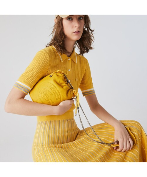 豊かなシボ感が上質感を漂わせる、プレミアムなグレインレザーを使用。シンプルなバケット形状とドローストリングで仕立てつつ、フロントにはワニロゴエンボスをレイアウト。クロームカラーのチェーンストラップの存在感もアクセントを添える、デイリーに使えるフェミニンなショルダーバッグです。