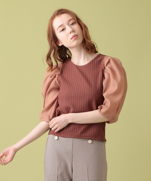 【マストアイテム♡ボトムを選ばない優秀ブラウス】 ♡Design Point♡ 透け感のあるパフスリーブが 大人の可愛いらしさを惹きだす優秀ブラウス。 身頃は針抜きのストライプレースで 袖はシアー生地の『透ける素材』の 異素材MIXが今っぽい1枚。 フロントはシンプルですが リボンを添えたオープンバックが さりげなく視線を誘います。 アウトもインもしやすい丈感なので ボトムを選びません。 ♡Fabric Point♡ シワになりにくいポリエステル100を使用。 速乾性にも優れているので 夏にさらっと着用しやすい1枚です。 シルキーでやや光沢感のある上品なブラウス。 透け感:あり 裏地:なし 伸縮性:あり 光沢感:あり