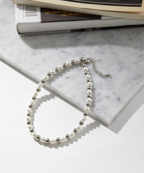 【素材】 パール調のビーズとメタル調のビーズ 【デザイン・シルエット】 パール調のビーズとメタル調のビーズを交互に配置したネックレスです。 【スタイリングポイント】 シンプルなシャツやTシャツに合わせるだけでトレンド感の出るアイテムです。