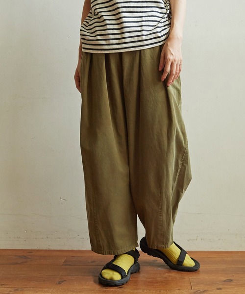 綿テンセルを使用した製品染めのカジュアルなボトムシリーズ。 ゆるっとしたシルエットに、 ウエストゴムで履き心地の良いパンツ。 裾にかけやや細くなっていて、 トップスとのバランスも取りやすい1枚です。 半端丈なので、 靴下の色味をポイントにした コーディネートもおすすめです○ コロンとしたシルエットのバックポケットがポイント。 9601PT006201と同型になります。 手洗い可 ※製品染めを施している為、商品により若干の色ぶれがある場合がございます。 製品の特徴となる為ご了承ください。 ※カーキ⇒着用商品はサンプルになります。 ※サンプル商品は、実際の商品と仕様、加工、サイズが若干異なる場合がございます。 ※撮影画像は、光の当たり具合やモニターの環境により色味が違って見える場合があります。 あらかじめご了承ください。