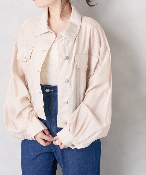 トレンドのシアー素材で、艶っぽい抜け感を演出 こなれ感がひかるシアーGジャンは春夏のコーディネートに欠かせない羽織りアイテム ■デザイン ・シンプルなのに一枚で存在感を放ち、 軽やかで清涼感のあるシアー素材でシーズンムード漂うスタイルに。 ・光沢のある生地を使用して、透け感が過剰に出るのを防いでいます。 ・ジャケットよりも軽く、シャツよりもしっかりとした生地感が魅力的。 ・素材と淡いカラーが春らしい軽いスタイリングにまとめてくれます。 ■スタイリング ・透けてもカジュアルかつ上品さが漂う柔らかなカラーリングで、さっと着用するだけで旬なコーディネートが完成します。 ・ロンTやボーダーなどシンプルなトップスにさらっと羽織るだけでこなれ感がプラスされます○ 冷房対策にももちろん大活躍! ・デニムはもちろん、ショート丈なので ・ワンピースやロングスカートともバランスよく着ていただけます。 ・合わせやすくカジュアルからフェミニンにも振れる万能アイテムです。 ----------------------------- 裏地:なし 光沢感:ややあり 透け感:あり 伸縮性:なし 生地の厚さ:薄手 ----------------------------- model:160cm 着用サイズ:FREE ※ご覧のモニター環境や撮影環境により実際の商品と多少色味が異なって見える場合がございます。 ご理解の程よろしくお願いいたします。