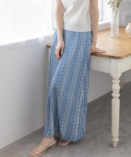 主張しすぎないエスニック柄のプリーツスカート 【デザイン】 小ぶりなエスニック柄なので、派手になりすぎない落ち着いたコーデに仕上がります。 プリーツ加工をしており、カジュアルになりすぎないのも嬉しいポイント。 ウエストはゴム仕様で楽に履いていただけるので、これからの時期のお出かけにもおすすめです。 【素材感】 さらっとした涼しげな素材感。 伸縮性:なし / 透け感:なし / 裏地:あり 手洗いによる洗濯可 / ドライ・ウェットクリーニング可 【コーディネート】 総柄のプリーツスカートなので、トップスはTシャツなどシンプルなものと相性◎ 足元はサンダルなどで涼しげなコーディネートにしていただくのがおすすめです。 【※お取り扱い上のご注意】 1:モニター環境等により実際の商品と多少色味が異なって表示される場合がございます。 予めご了承下さい。 2:屋外で撮影された商品は、天候により多少実際のカラーと異なる場合があります。 商品のカラーに参考される場合はトルソー(マネキン)の商品画像をご参照ください。 3:濃い色の商品は、お洗濯や摩擦等による移染にご注意ください。 4:末永くご愛用頂く為に、アテンションタグ・洗濯ネームを必ずご確認の上、着用又はお取り扱い下さい。 5:生産時期により、色、サイズ、デザイン、素材の質感が多少が異なる場合がございます。 あらかじめ御了承下さいませ。