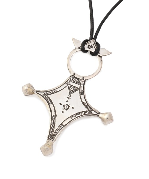 ブランドロゴにもなっているサザンクロスを型取ったシルバーネックレス。 全体に彫られた文様が美しく、存在感のあるネックレスになります。 紐部分の結び目を移動させることで、紐の長さを調節することができます。 目を引くデザインのため、シンプルなスタイルをなど、 様々なコーディネートのアクセントとしてご使用いただけます。 ■型番:AGADEZ NECKLACE 【ADWAT'N TUAREG(アダワットゥン トゥアレグ)】 アフリカはサハラ砂漠で暮らすトゥアレグ族。インディゴ染めの青いターバンで男性が顔や身を隠すため、「青衣の民」と呼ばれ、女系社会としても有名な砂漠の遊牧民です。彼らの作る銀製品は代々受け継がれ、伝統工芸の一つになっています。 アフリカにおいて初めて銀細工を始た民族との説もあり、ヨーロッパではインディアンジュエリーと双璧をなすネイティブジュエリーとしても認知されています。 一刀一刀手彫りで丁寧に彫られる模様は、魔よけなどの意味が込められており、古代の神話や民話の影響が色濃く残っています。 シャープでありながら丸みがある独特のデザインで男女問わず楽しめるシルバーコレクションになっています。 ADAWAT'N TUAREG 商品一覧はこちら