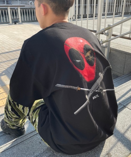 MARVELコミック出版の1991年「New Mutants #98」に初登場以来、破天荒で善悪に拘らない特異なキャラクターで愛されるウェイド・ウィルソン=DEAD POOL。 今作はBAIT×DEAD POOLのコラボレーションコレクションで、左胸にはフェイスロゴ、バックにはDEAD POOLの顔と愛用の刀とSMGがクロスした、傭兵である彼らしいグラフィックがプリントされたS/S Tee。
