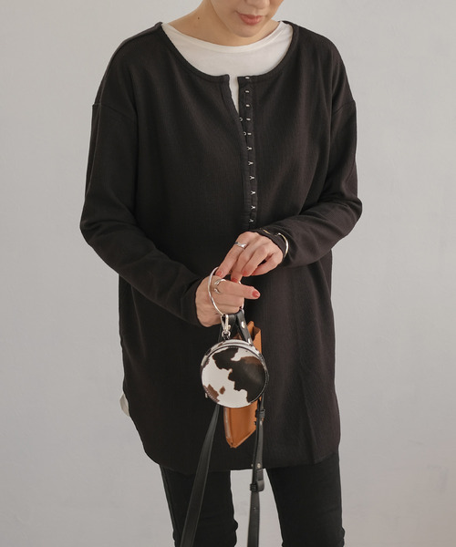 前後2WAYが魅力のTシャツカットソー。 フロントのホックテープがポイントの変形リブチュニック。ホックテープ部分を後ろにすればVネックTシャツとして使える2WAY仕様。落ち感のあるゆったりしたシルエットで女性らしさをUPしてくれます。柔らかく肌触りの良い起毛リブカットソー生地でロングシーズン使えてレイヤードにもおすすめな1枚です。 ■コーディネートアイテム パンツ… bf09q05012 パンツ… bf76q04697 ■商品仕様 リブカットソー生地 裏地…なし 伸縮性…あり 透け…淡色のみあり ポケット…なし 付属品…なし 着脱…プルオーバー ※淡色は透けますのでインナーの着用を推奨します。 【ご購入前に必ずご一読下さい】 ※モニタ環境によって、商品の色合いが多少異なる場合がございます。 ※色落ちの恐れがありますので、他のものと分けてお洗濯して下さい。 ※商品をお安く提供させて頂く為、検品後のアイロン掛けは省略させて頂いています。 発送時も簡易梱包の為、お受け取り時にたたみ皺があると思いますがご了承下さい。