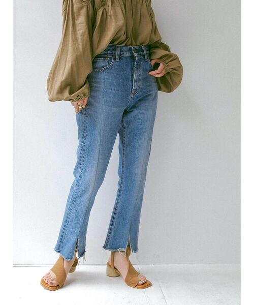 裾部分にスリットデザインを施したデザインデニム ◆デザイン 丈感は短めに設定しスリットから見える肌が抜け感を演出し夏にぴったりな1本です。 【スタイリング】 フリルデザインのブラウスと合わせてミックススタイリングがオススメ。 足元はラフなサンダルで抜け感を演出するとお洒落見えです。 ・・・・・・・・・・・・・・・・・・・・・・ 透け感:なし 裏地:なし 伸縮性:なし 光沢感:なし 生地の厚さ:普通 ・・・・・・・・・・・・・・・・・・・・・・