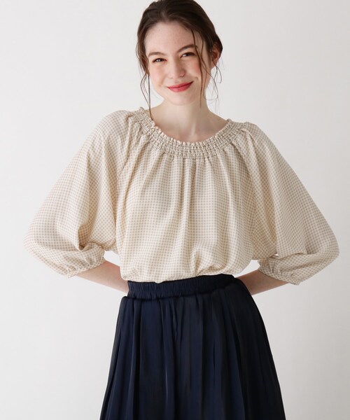 【デザイン】 首元にシャーリングを施し、女性らしいネックラインに仕上げたブラウス。 ゆったりとした身幅とドルマンスリーブで、気負わないラフな着こなしを叶えます。 スタイリングに爽やかな風を呼び込むギンガムチェック柄も◎ 【生地感】 しっとりと柔らかみのあるポリエステル100%生地。 ※こちらの商品は透け感があるため、インナーの着用をおすすめします。 【サイズ】 小さいサイズSサイズあり。※01(S)サイズはWEB限定サイズです。 #CutieBlonde#Cutie#cutieblonde#cutie#キューティブロンド#キューティ#20代#30代 モデル情報:身長170cm B80 W59 H85 着用サイズ:02(M) 店舗へのお問い合わせ商品番号:256-82005 ●製品寸法: 01(S):着丈58cm B124cm 裄丈62cm 02(M):着丈61cm B126cm 裄丈64cm 03(L):着丈64cm B128cm 裄丈66cm 備考: